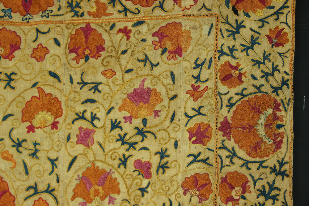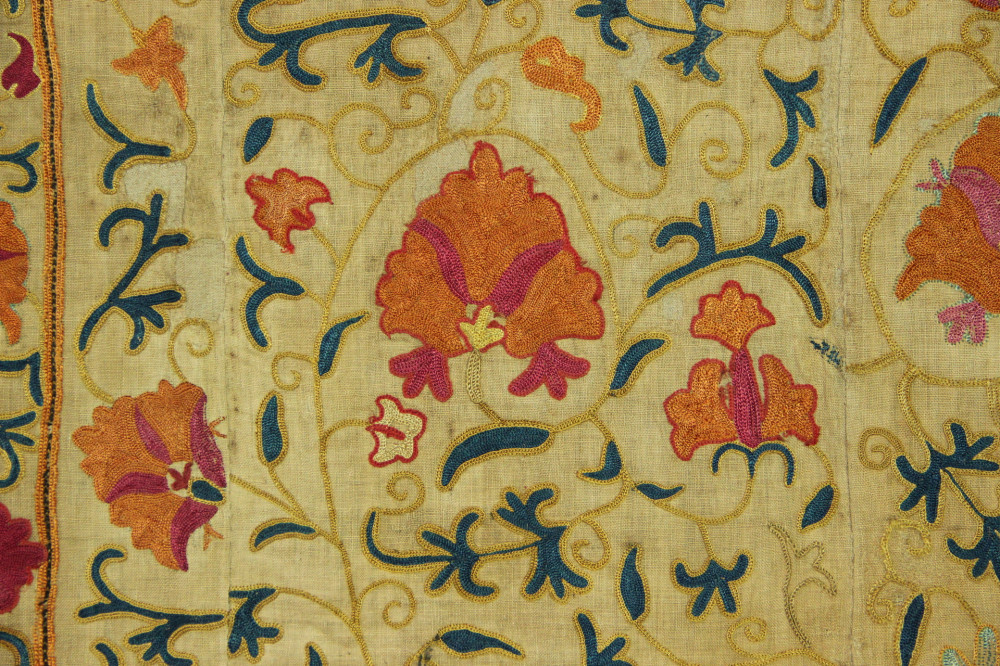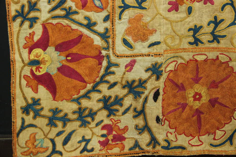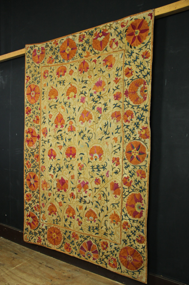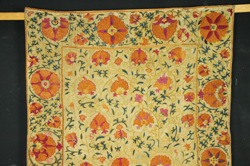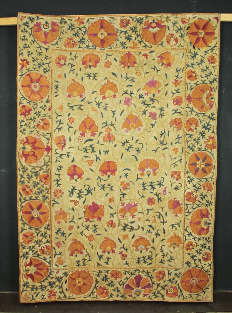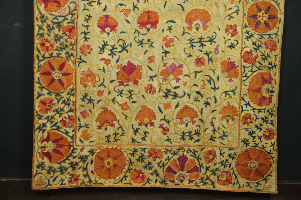These small suzani are referred to as 'Nim' which literally means 'Half', and are very popular with decorators and collectors alike. The silk embroidery on cotton is beautifully drawn and resembles a small garden.