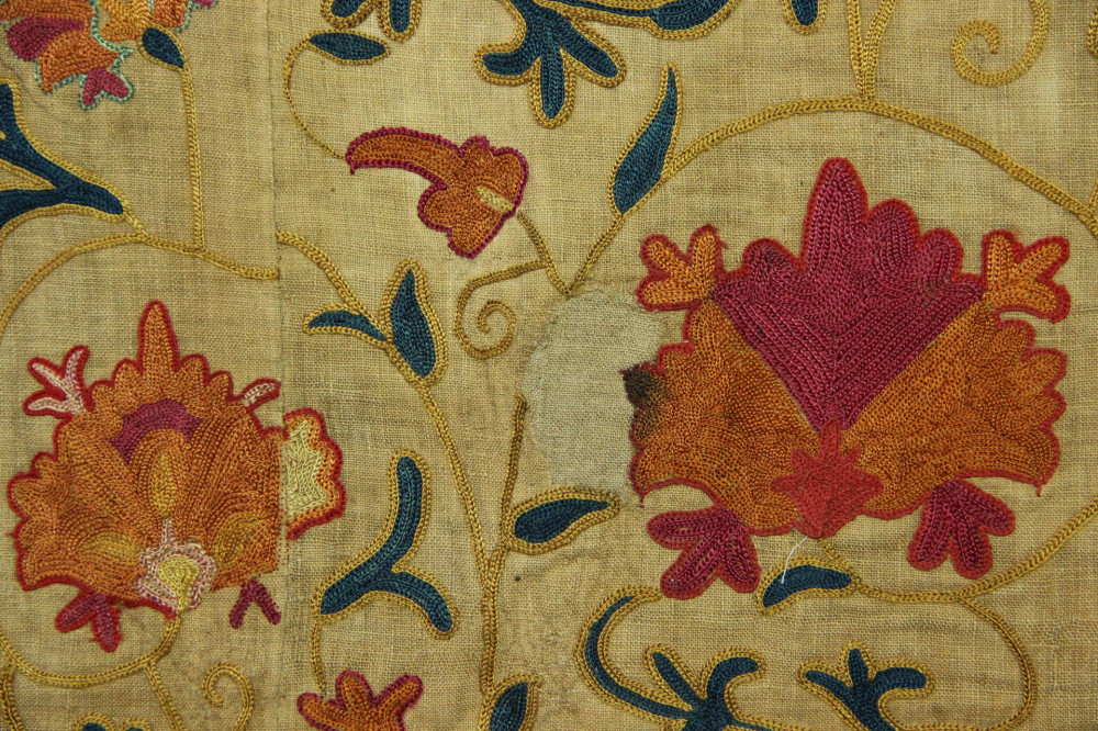 Condition: Professionally conserved, a few small holes couched onto matching colour lines, embroidery slightly rubbed in places