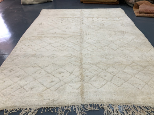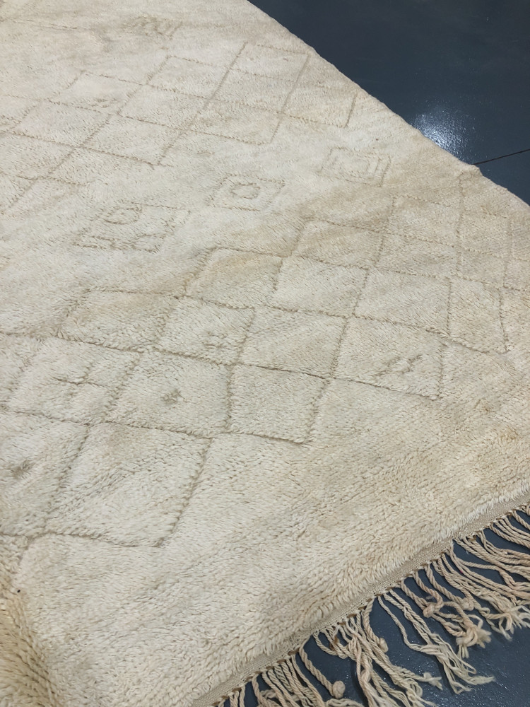 Beautiful plain white handwoven Moroccan berber rug with simple geometric design.