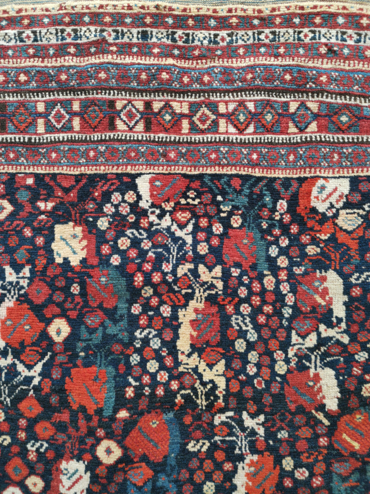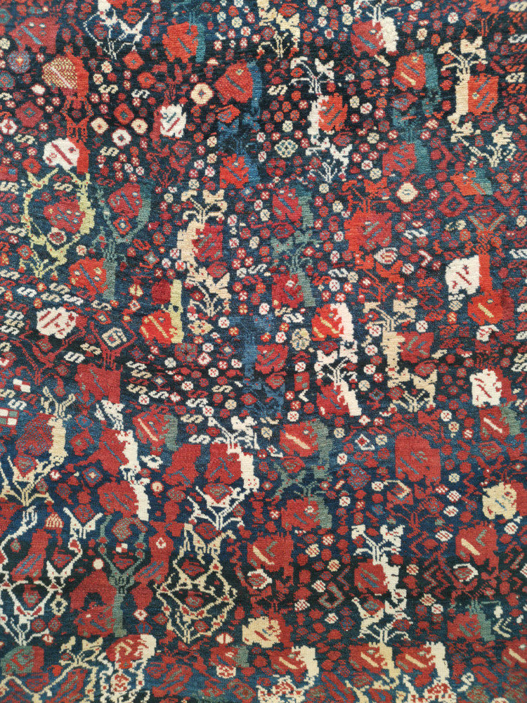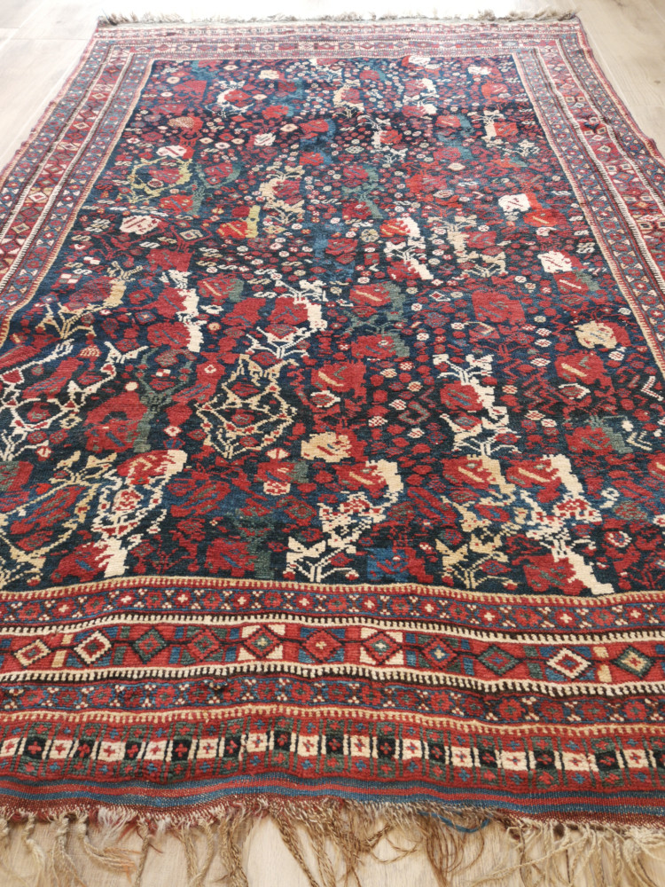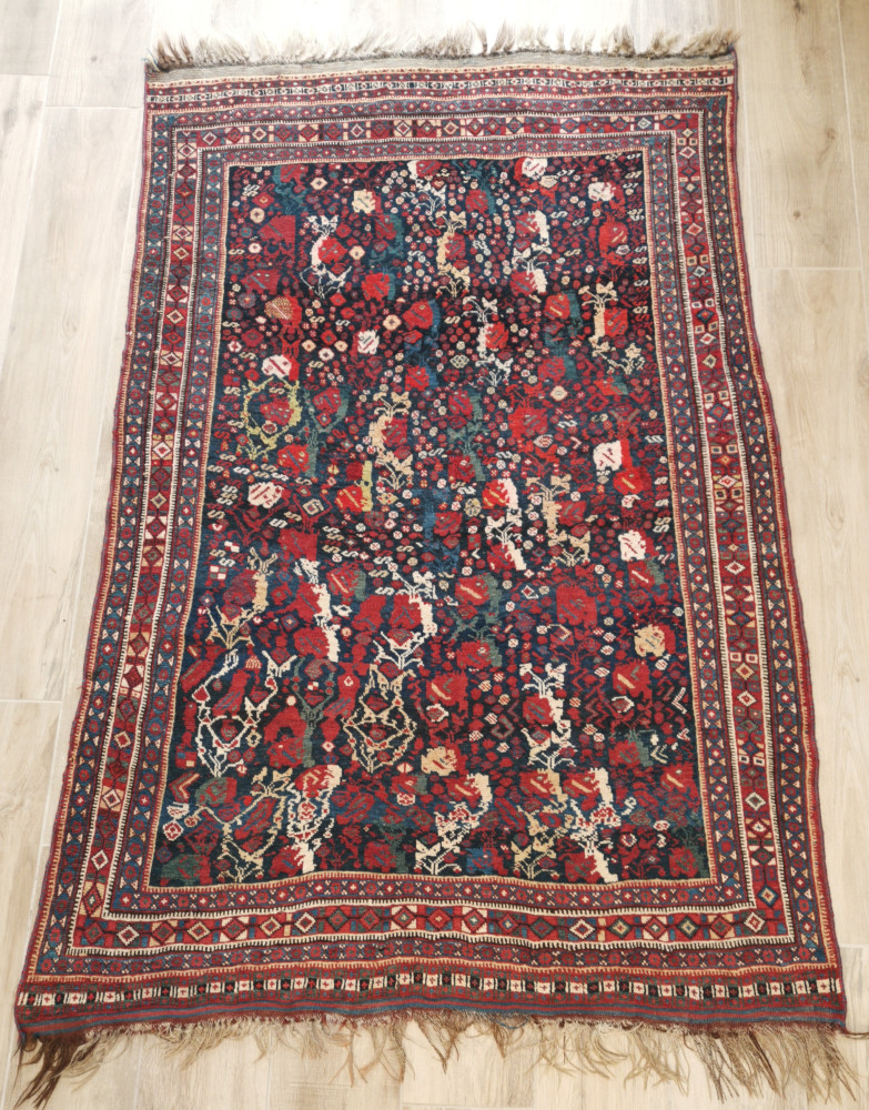 This rug has a fascinating design, I think it derives from Gul Farang or western flower but the outcome appears more like a piece of abstract art. The decoration is quite random and the whole field is a riot of colour with stylised flowers cramming every inch of space. All of this set within a very formal Khamseh border which contrasts with the chaos of the field. The wool is soft and the rug quite floppy as one would expect on a good old tribal rug. This is a rug that will retain its interest for a lifetime, a very unusual and lively piece.