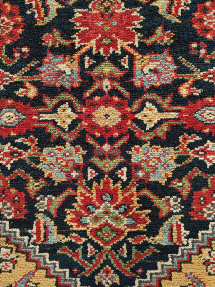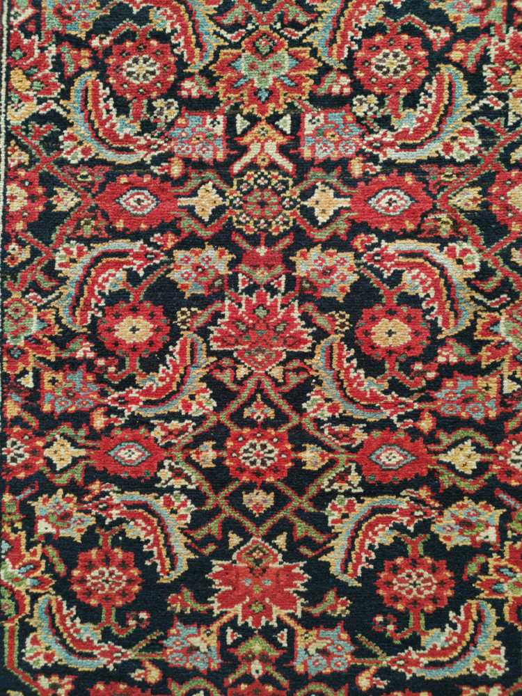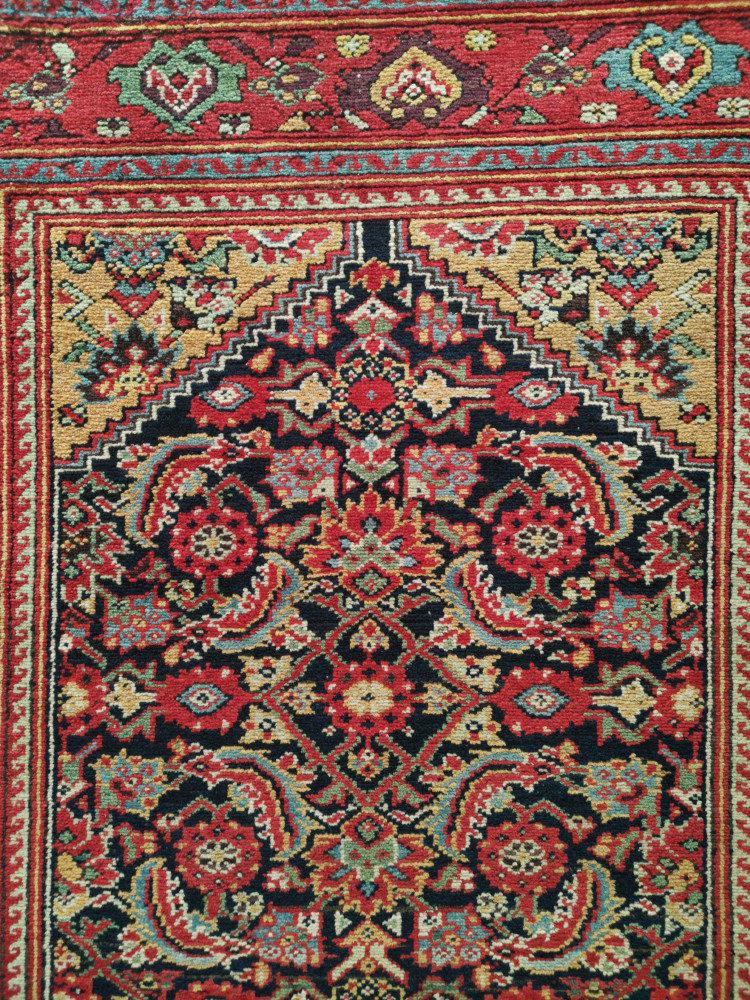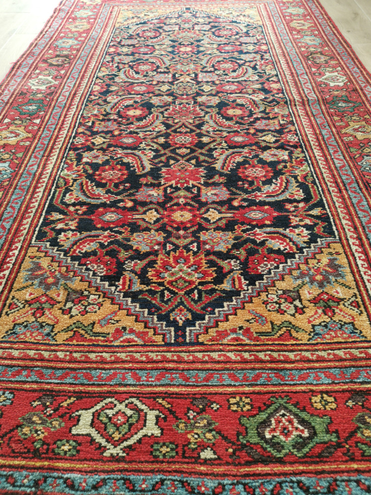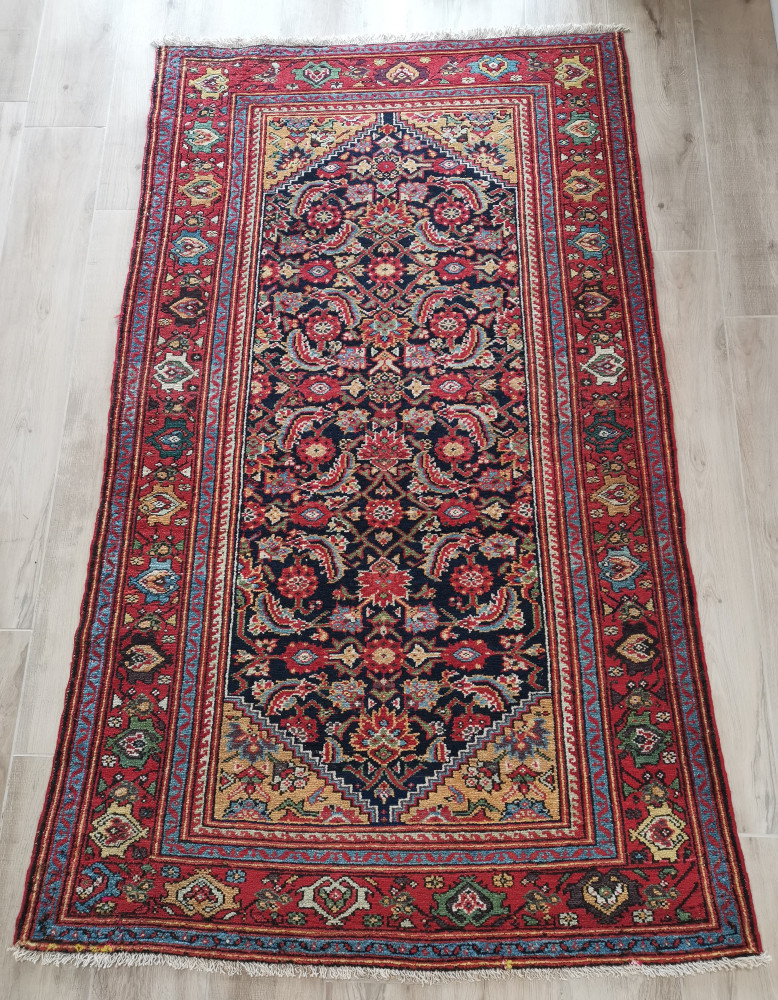 This rug has a very fresh palette with good strong colours. The field contains an allover herati pattern typical of Feraghan rugs, this is flanked by four yellow spandrels and some lovely minor borders. The reciprocal red and white border frames the field and the major border full of colour is itself bordered by red ribbons on a blue background. These rugs form northern Iran have cotton foundations making them sturdy pieces which generally lie flat.