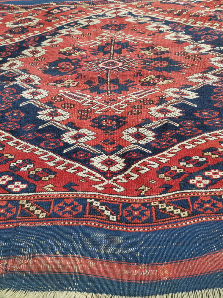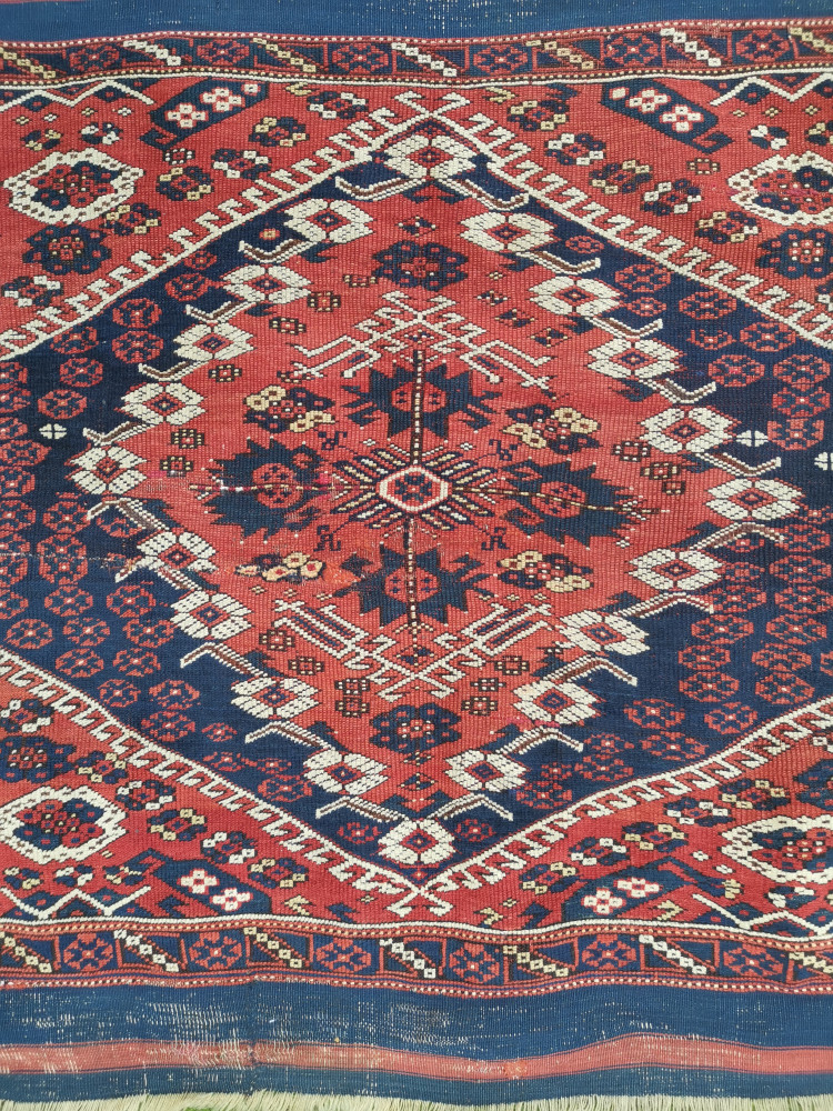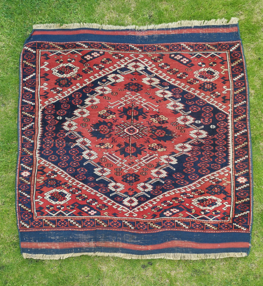 These small square rugs from western Anatolia were dowry pieces, they are light and floppy to the feel and the palette shown is typical of the region. This is a good old example, quite finely knotted for a village rug it has its original kelim ends. The central diamond is beautifully decorated with a complex mirrored design with the border constructed from stepped floral motifs. The random placement of the flowers on the blue background is wonderful, they crowd together and bump into each other. Occasionally one obscures part of its neighbour appearing to slide over it creating a sense of depth. A very good example of the type with a well drawn design.