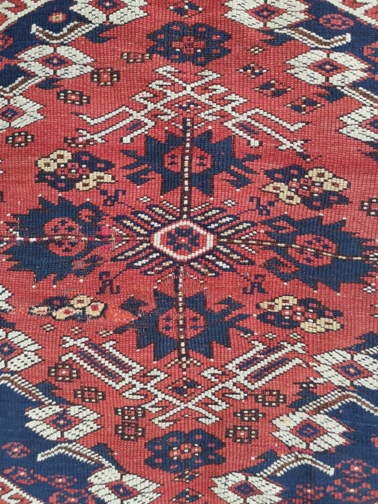 Condition: Fair condition with some wear, the main issue is a tension repair where a crease has been removed and the rug sewn back together.