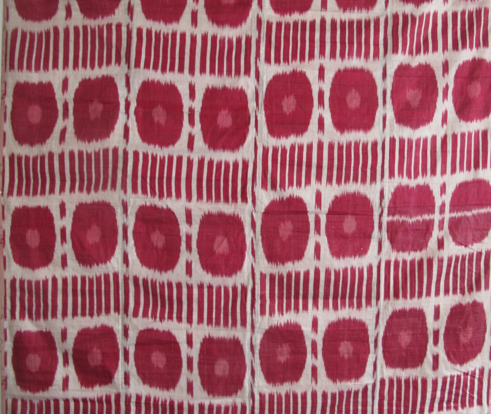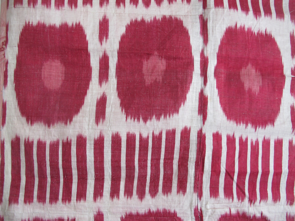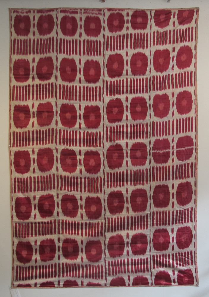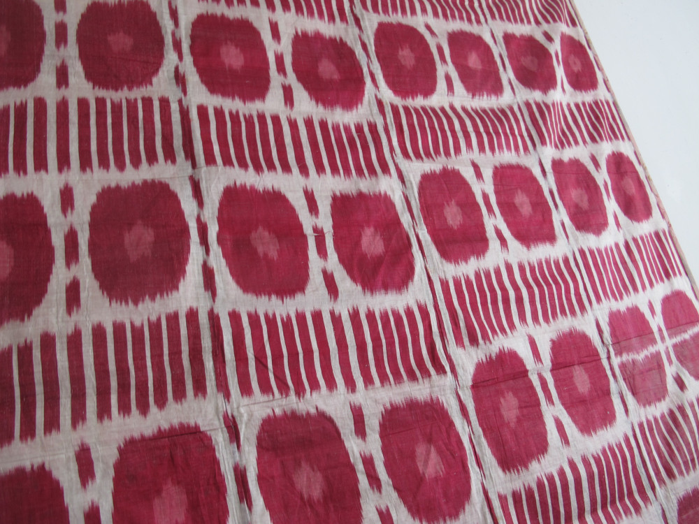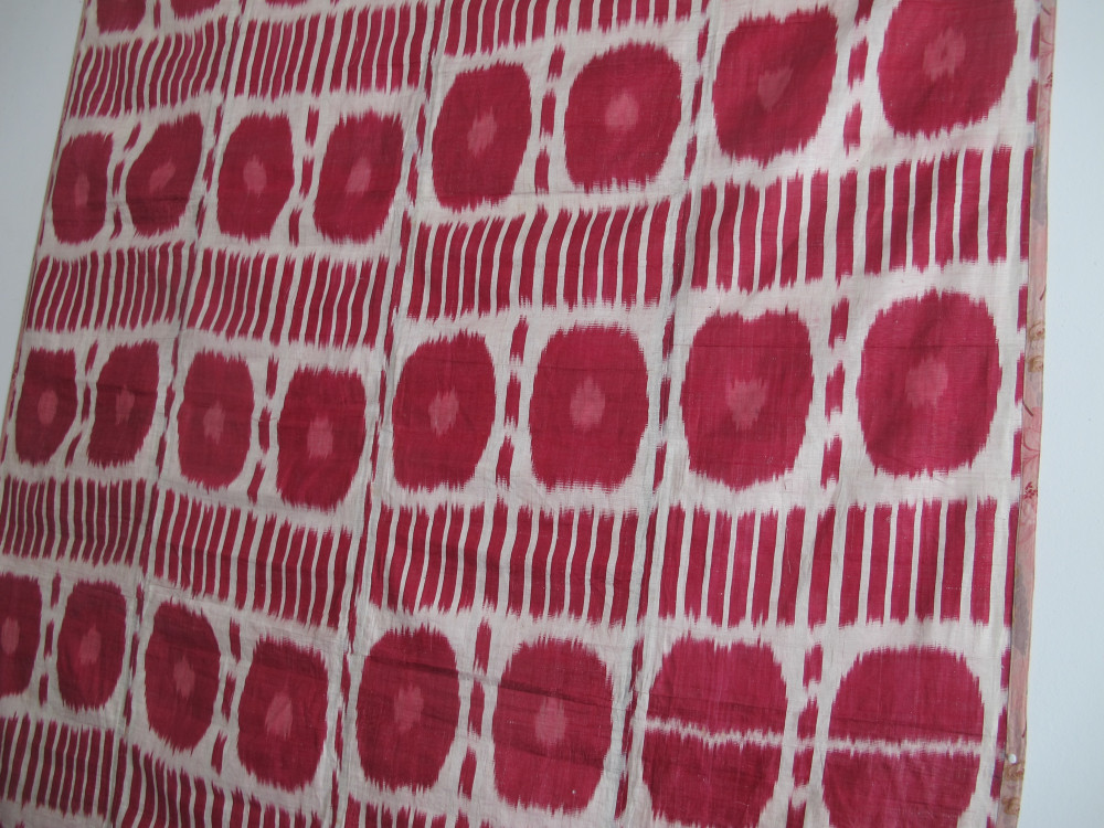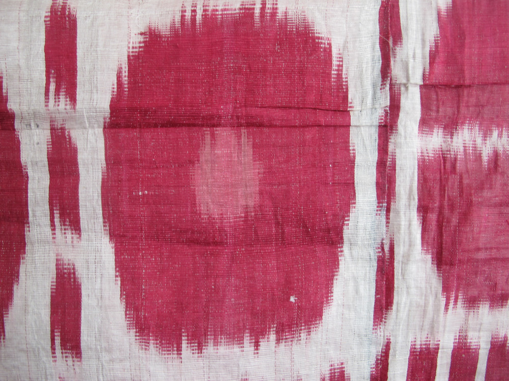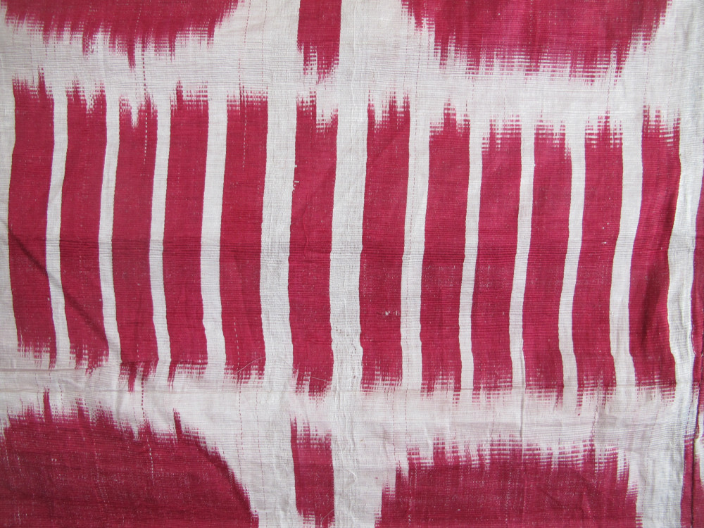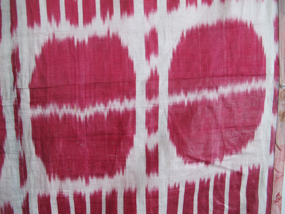 This is a striking Uzbek silk ikat panel. Only two colours, a pink and a magenta, have been used on the ivory silk background, to create a really dramatic composition. The panel is unusually large, and in great condition, and would make a beautiful bedspread or wall hanging.