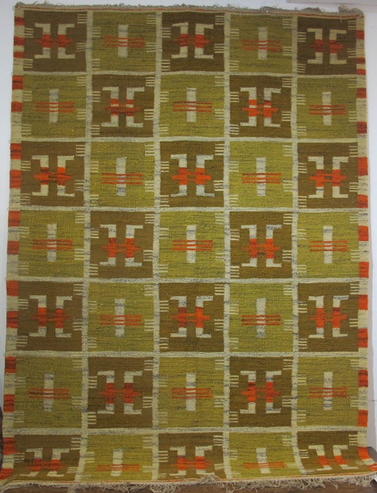 Woven with soft wool in the interlocking tapestry technique, this lovely piece is one of a group of Central European tapestries that were designed to work with contemporaneous furniture which are now very much in vogue with interior designers. The combination of earthy autumnal colours and abstract geometric ornamentation is very attractive and highly decorative. One could imagine this piece is any number of modern settings. Interestingly, it has rings to the back which suggests that it was hanging up along its horizontal axis! Whether landscape or portrait format, on the wall or floor, this great piece would add character and style to modern settings. Note also that this group are still at affordable price levels, but the trend is most definitely upwards.