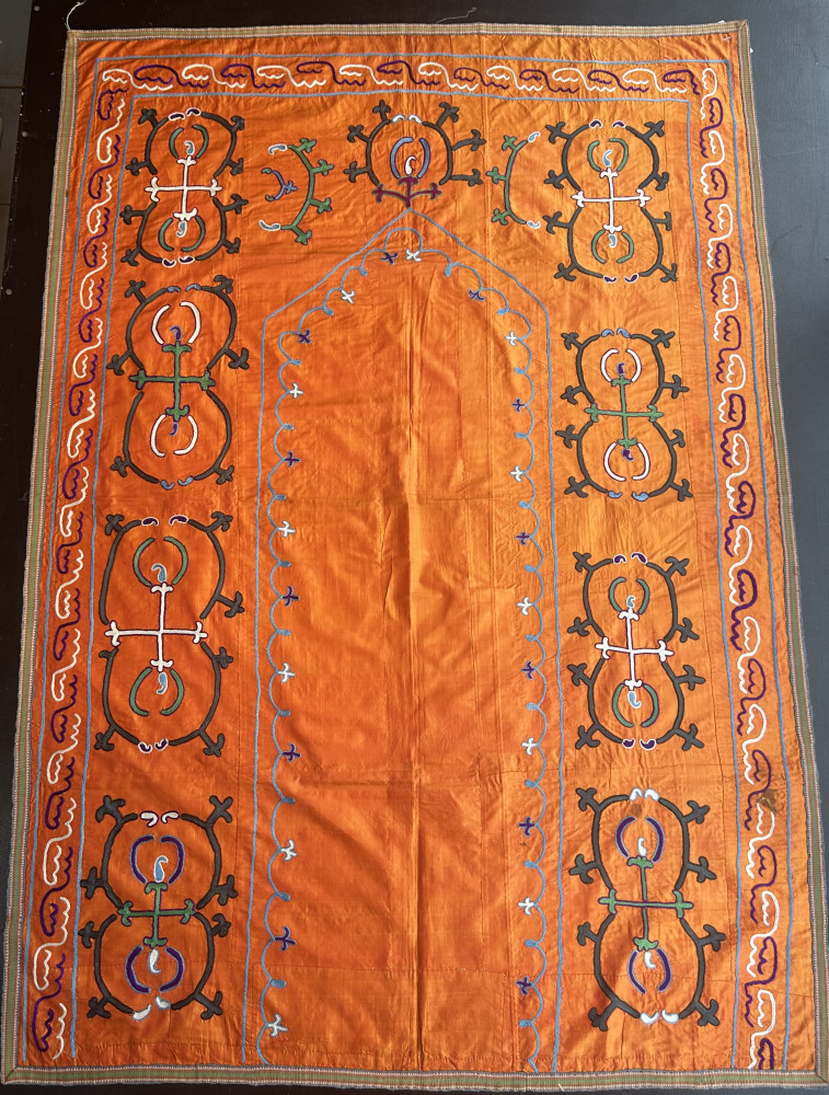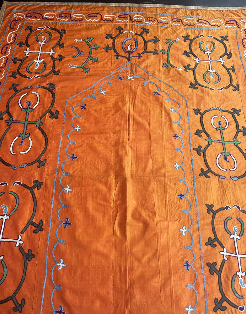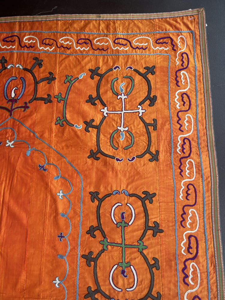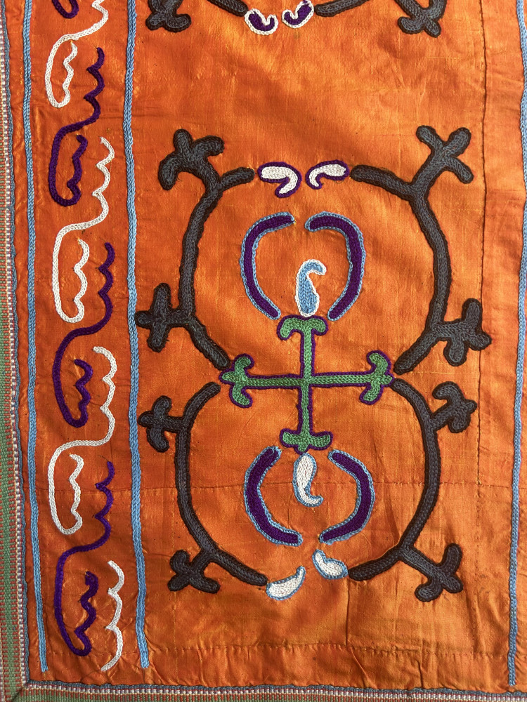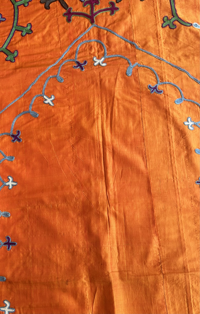 Embroidered in a tangerine silk background, this decorative Suzani has a simple yet elegant architectural design.
