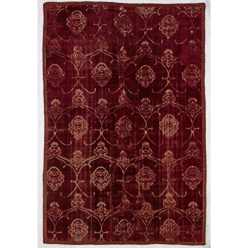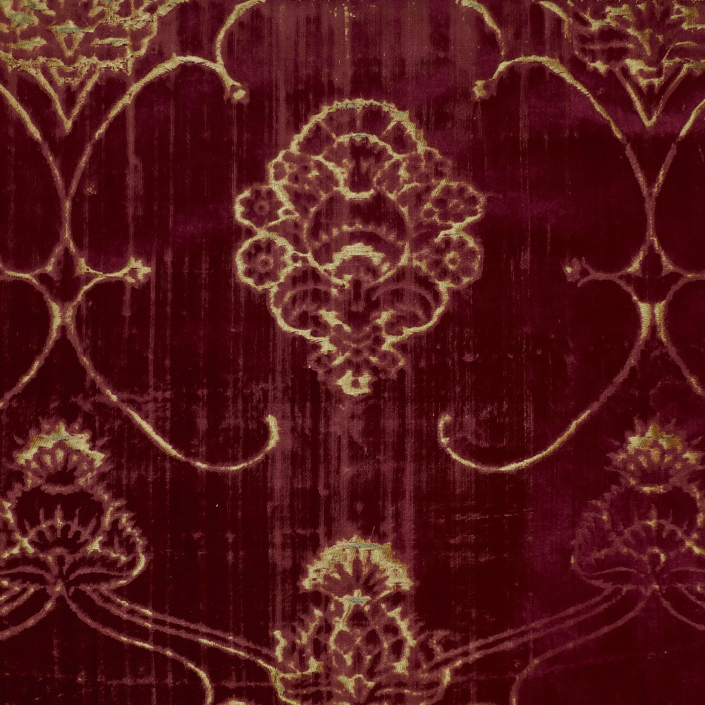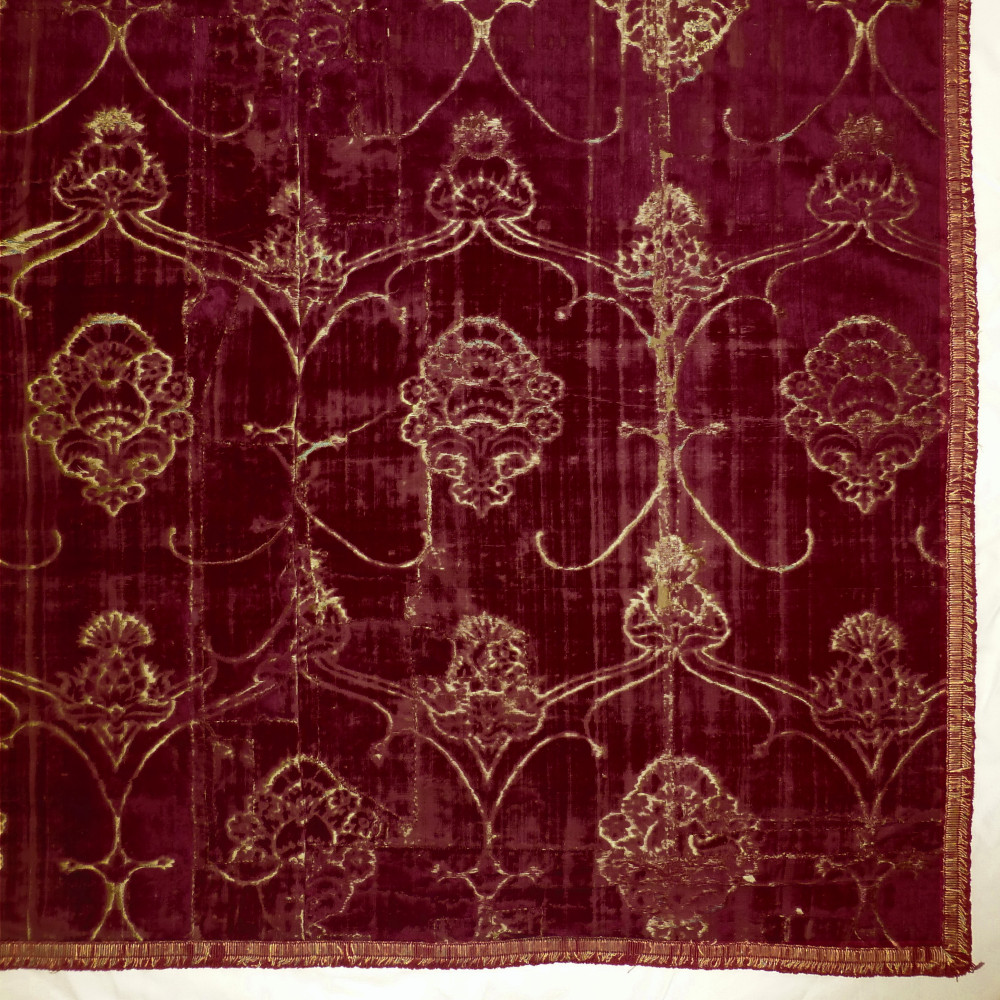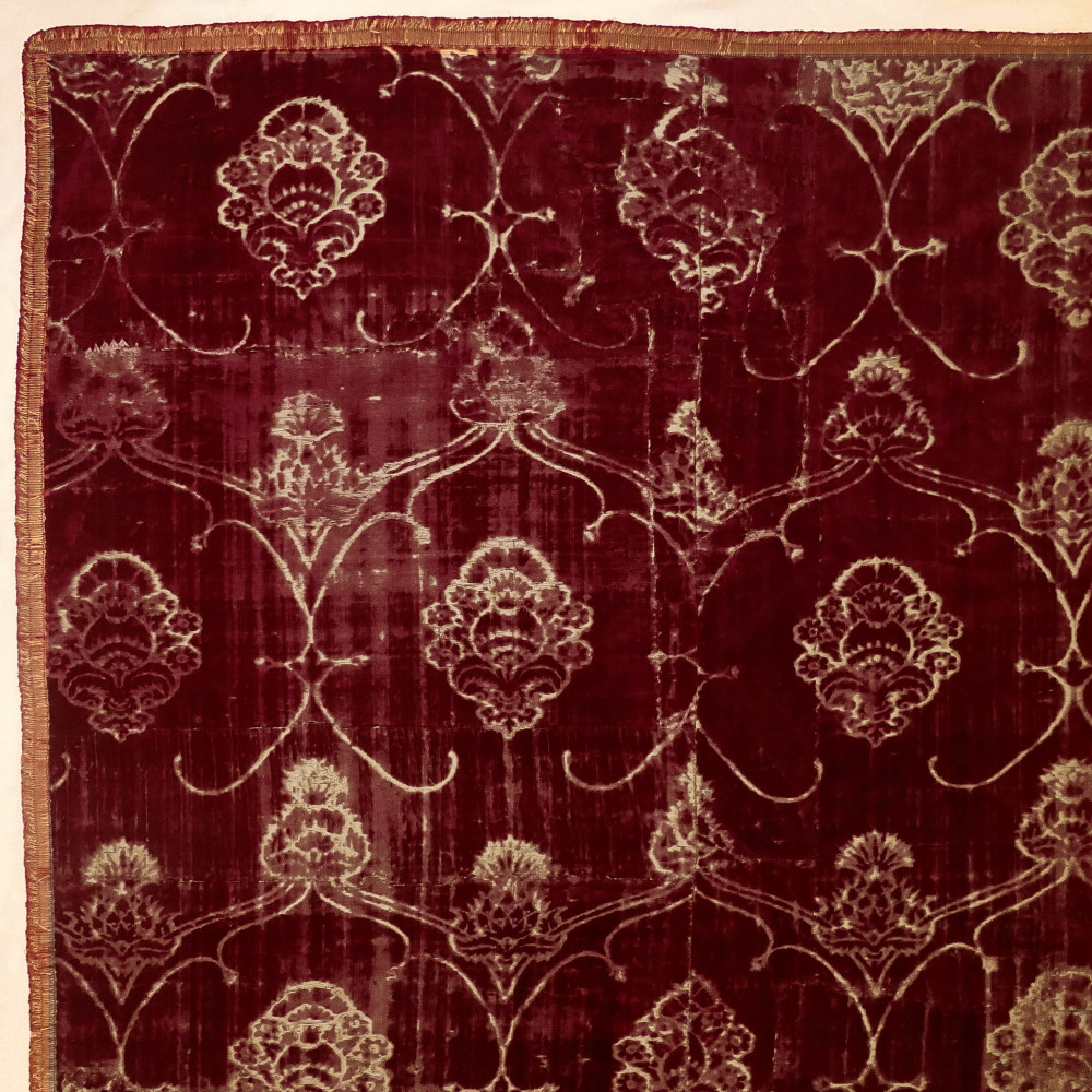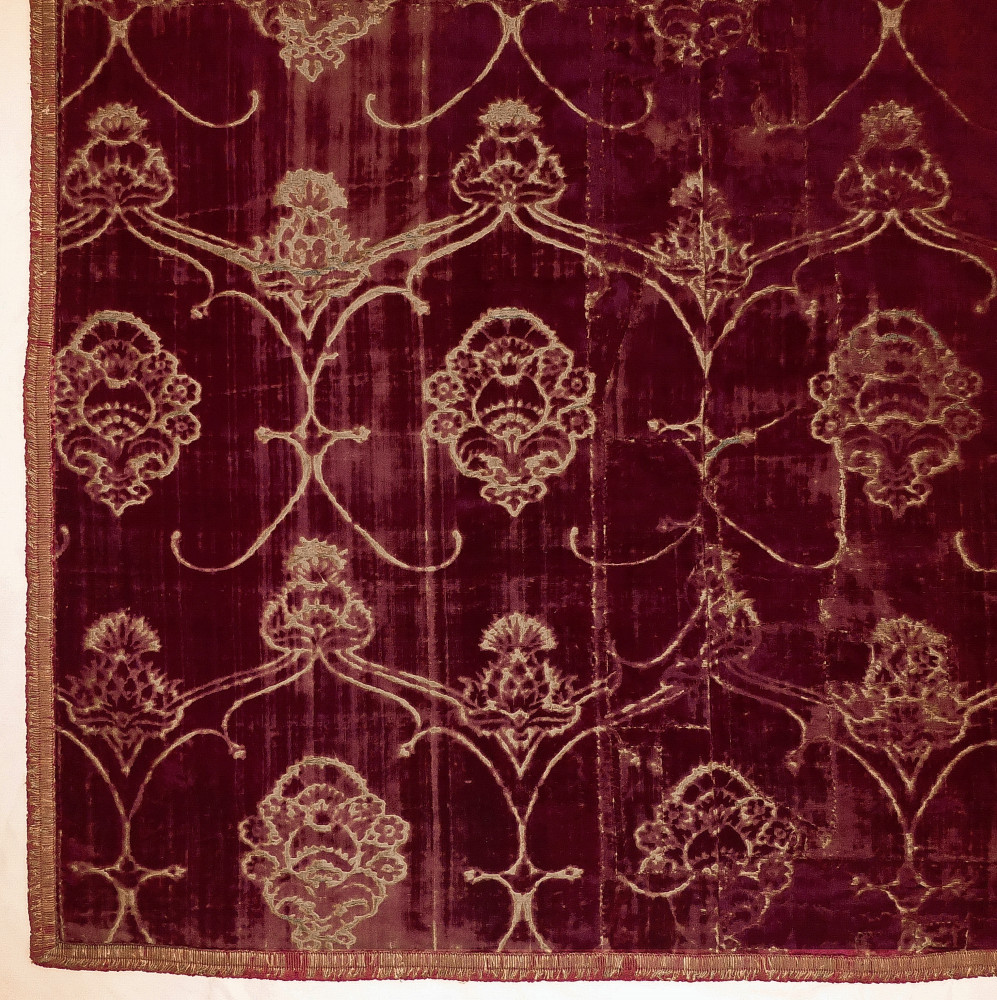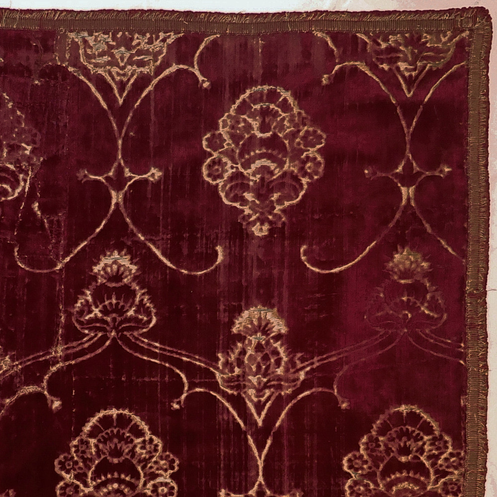 The burgundy silk velvet of ferronerie design with stylised pomegranate and thistle motifs. Consisting of joined panels, and bordered with a 16th/17th century braid of silk and metal thread and backed with a blue linen of similar date. The term “ferronerie” - usually employed to denote this class of velvets - is due to the resemblance to ironwork of the voided patterns within which the pomegranates and thistles are arranged.