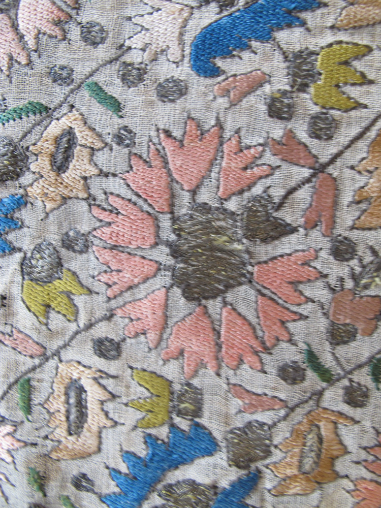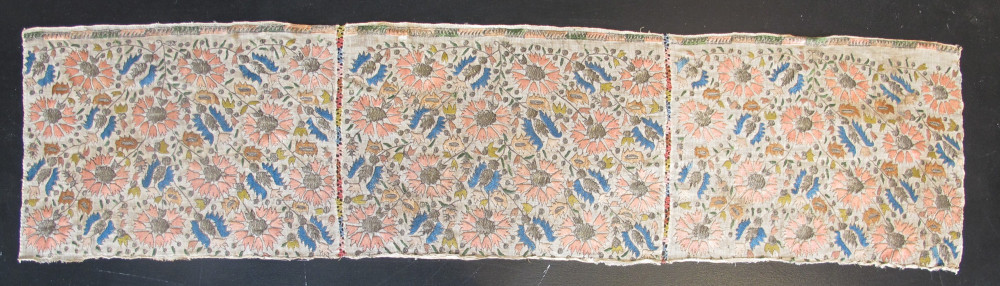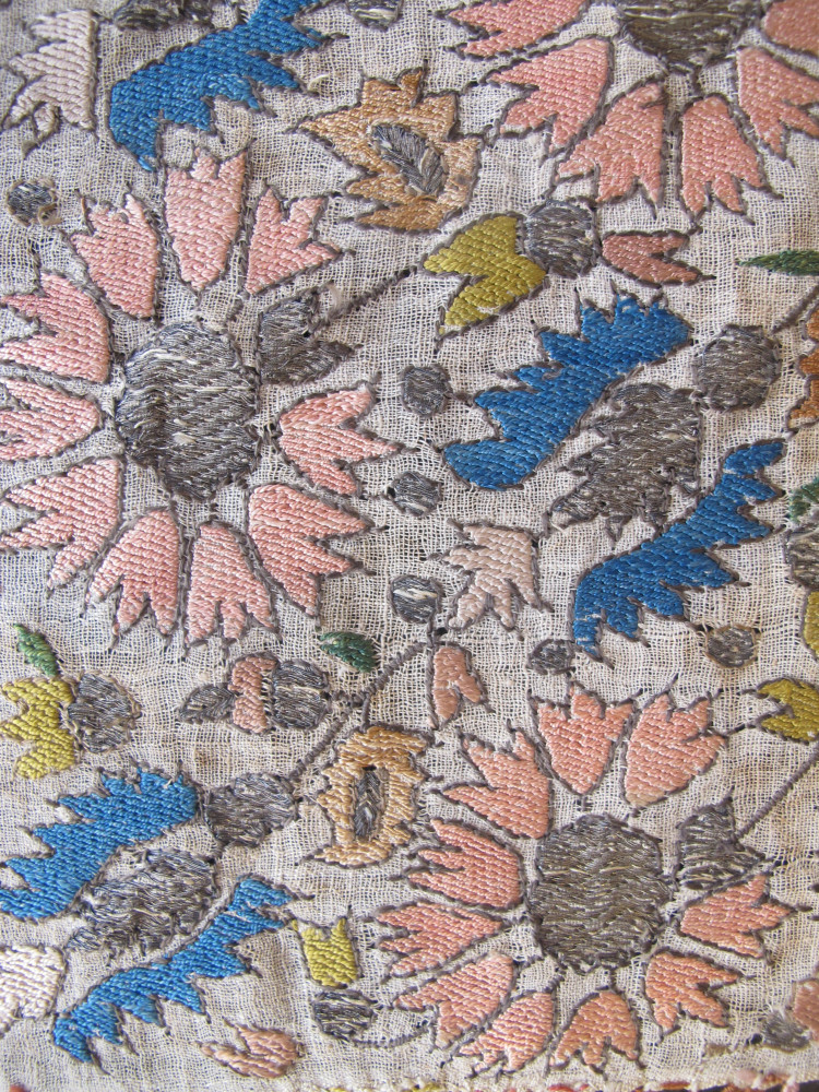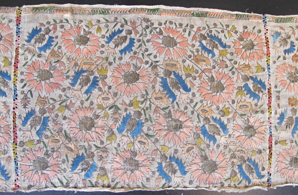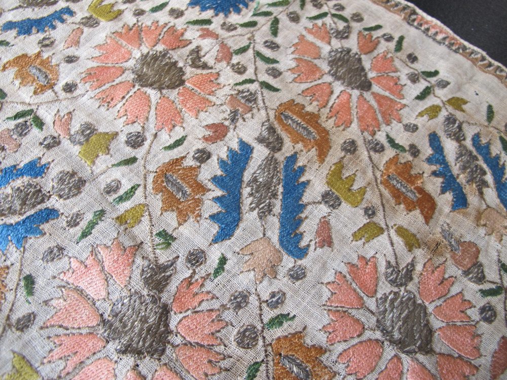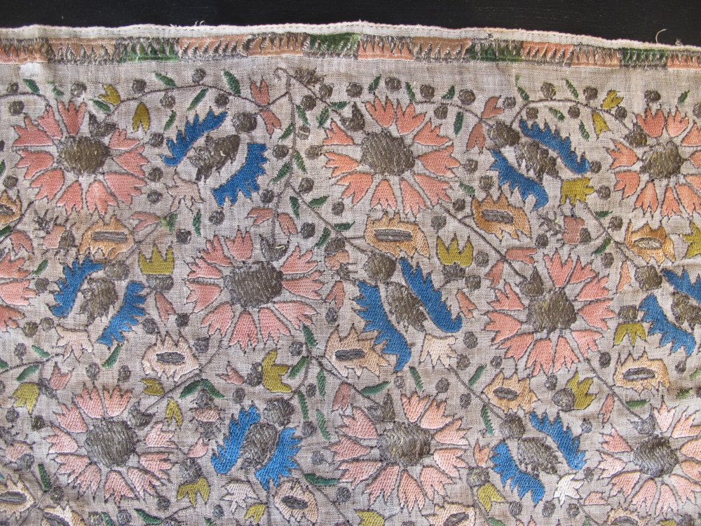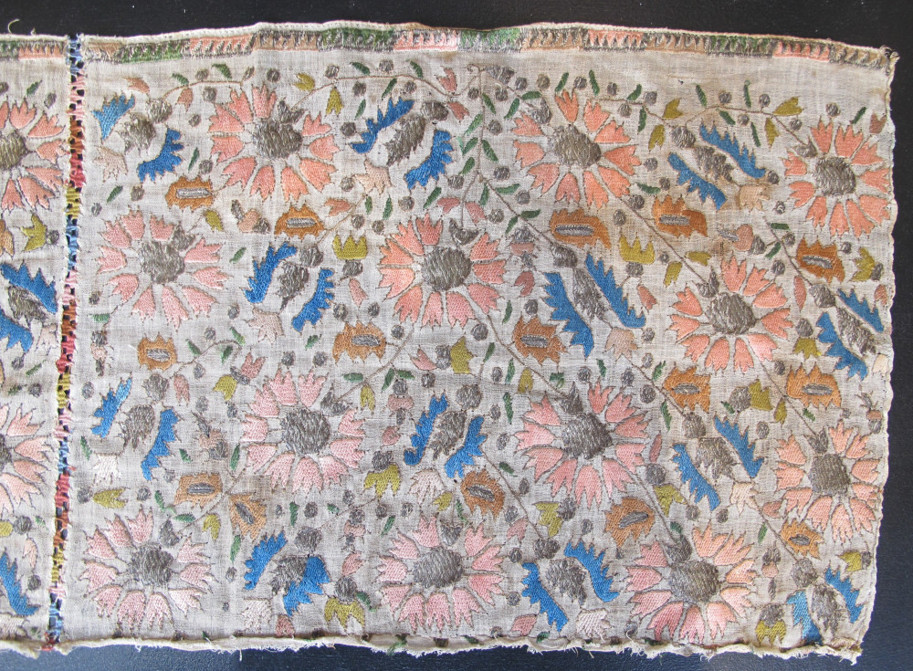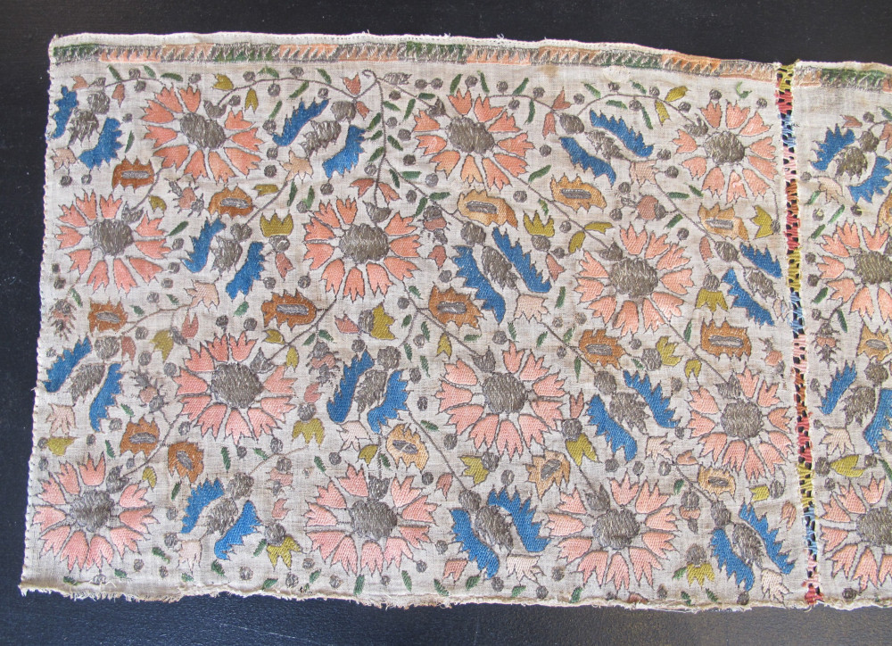 Dating to around 1800, this lovely item is composed of three skirts from embroidered towels which have been sewn together to create a highly decorative panel. The designs across the three panels appear to be very similar suggesting they came from a matching pair. Embroidered delicately in silk on a fine linen background in delicate shades of pale blue, pink and olive green, combined with generous use of silver thread, the floral design flows elegantly creating a lovely calm ambience. Ideal for hanging.