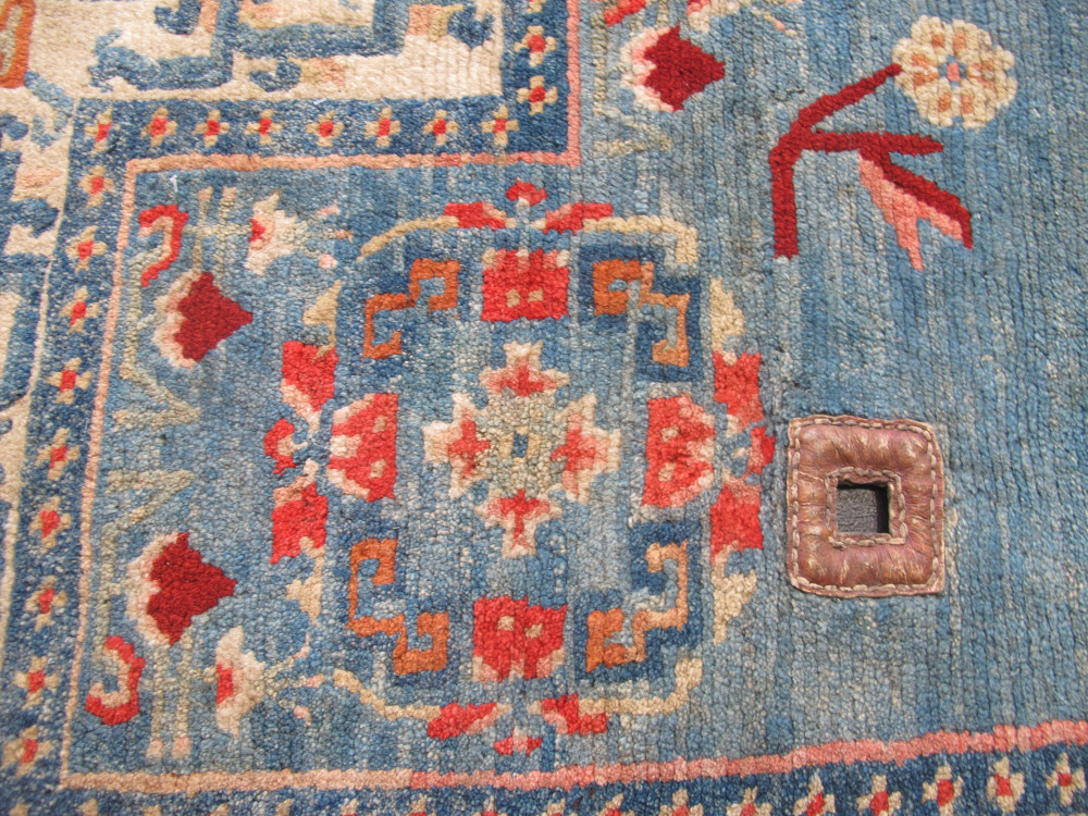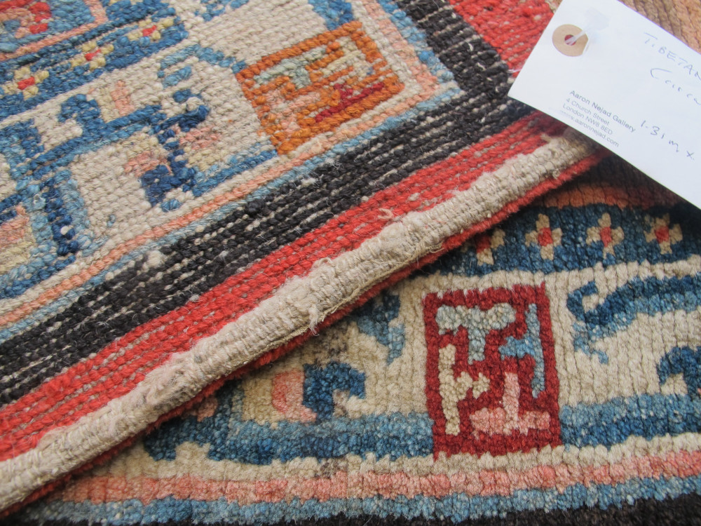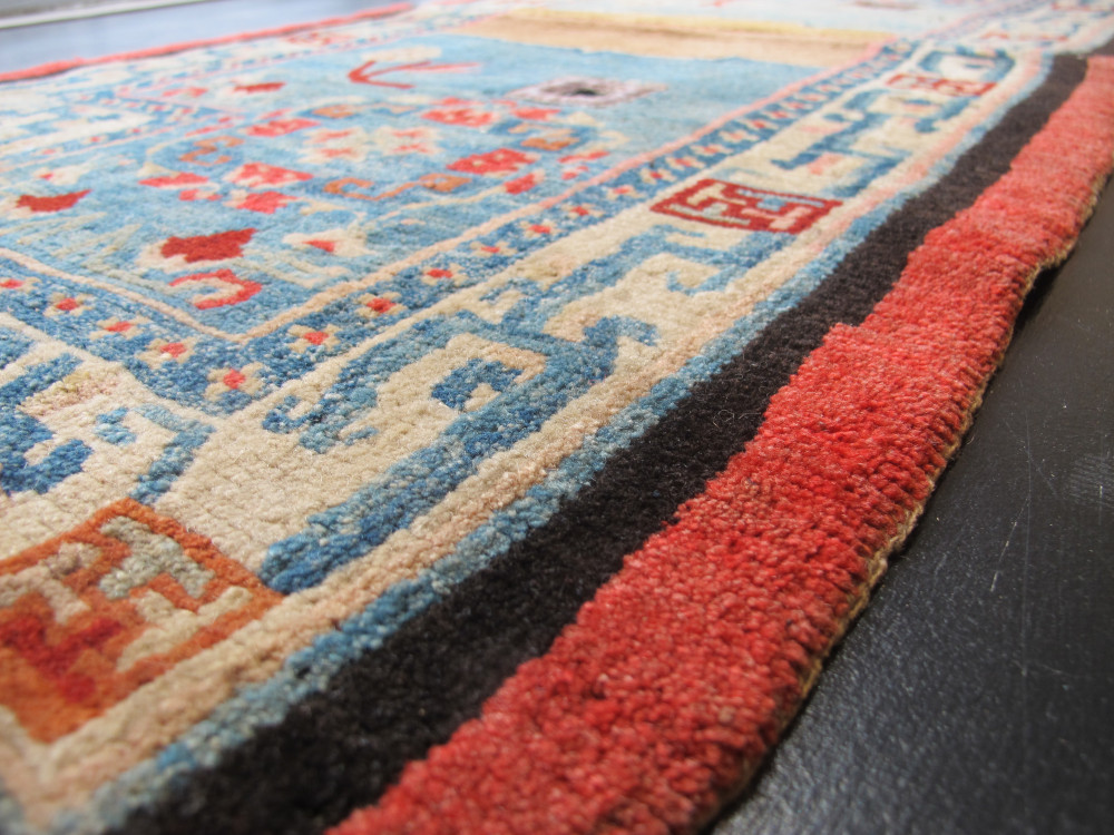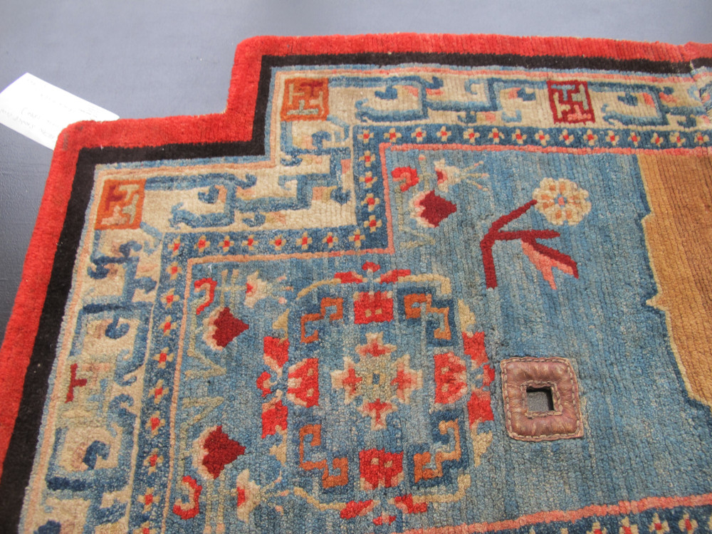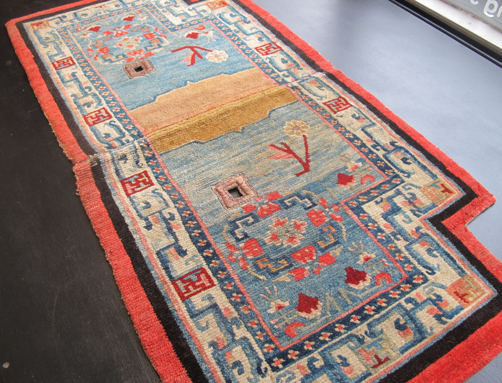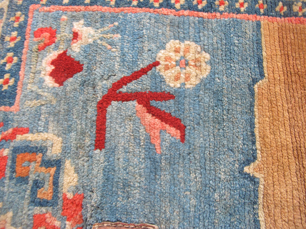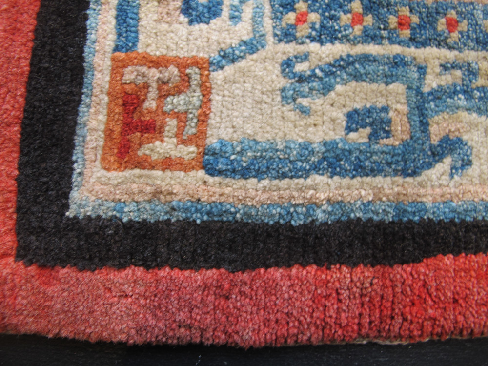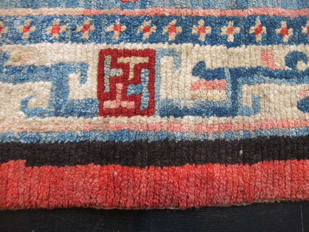 Tibetan art and textiles continues to fascinate us, while good examples become harder to find. However, this recent find is a truly beautiful weaving. It is a textile with charisma. Originally made as a saddle cover, it appears to have been used very sparingly and only on special occasions.The wool quality is wonderful, soft and fleecy, and it is in excellent condition with an even velvety pile. The abrashed sky-blue field really catches the eye, and is complemented by the other subtle tones of pink, red, caramel and ivory. The classic field design is lovely, and is matched by the classic ivory border filled with ancient symbolism. Professionally cleaned, this rare and striking piece is both collectible and decorative, and would be a very good purchase for a discerning buyer.