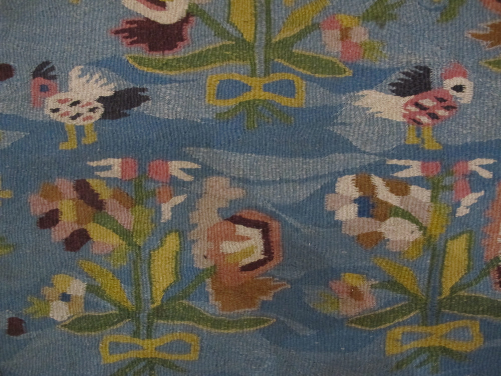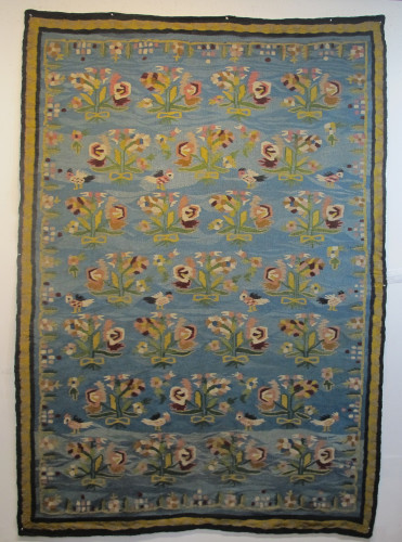 At one time this beautiful and rare tapestry would have been included in the generic term 'Bessarabian' kilim denoting a weaving produced anywhere in the Central or South-East Europe. Today, I believe we can attribute it with confidence to the Kyiv region of Central Ukraine. Dating to the second half of the 19th century, it has the technical characteristics of that region including hemp warps, fine soft wool, interlocking wefts which create a solid fabric, exquisite natural dyes, and the ubiquitous use of curved or 'eccentric' wefts. The design is a masterful example of Ukrainian folk art. Rows of offset shrubs mingle with hook beaked exotic birds and other floral ornaments. This composition is framed by a meandering vine within the light blue field and then a separate narrow outer border. The colours are quite wonderful, enhanced by the brilliant use of abrash in the light blues, greens, pinks and yellows that give a sense of depth and texture. Delightful. Note also a beautiful deep purple. Cherished through the generations, this piece has survived in very good condition. It has recently been professionally cleaned.