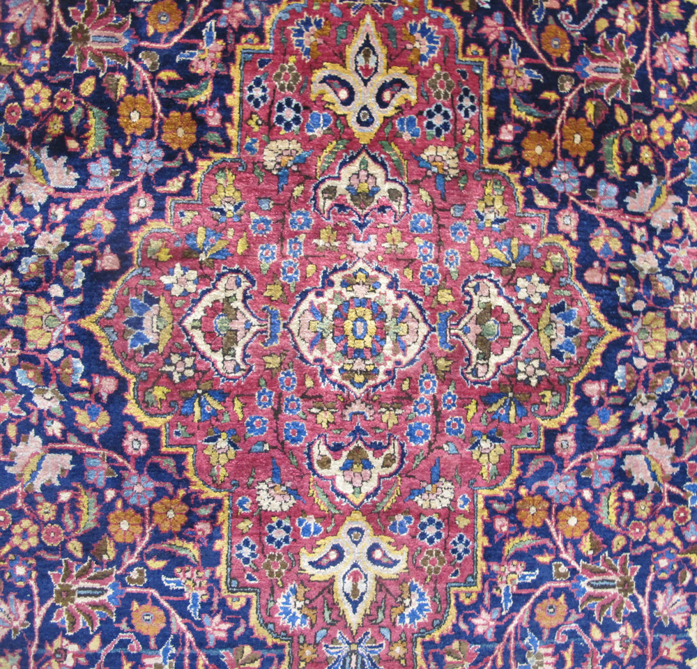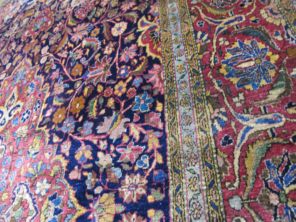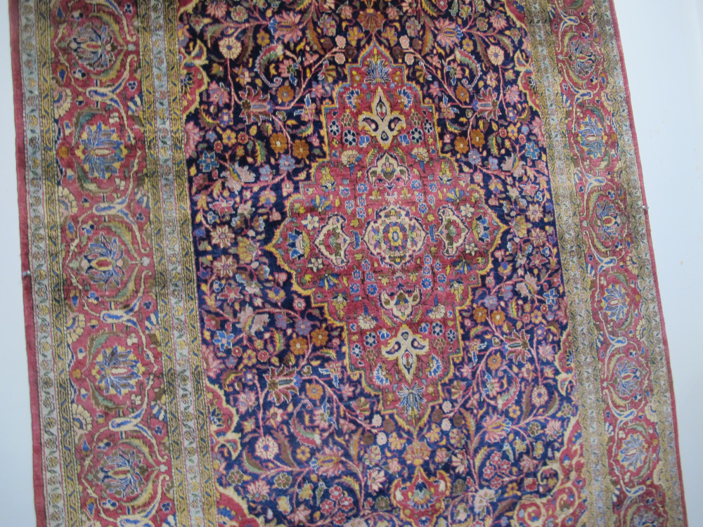 This beautiful silk Kashan rug is an exceptional example of early 20th century Persian rug weaving. The silk quality is superb - soft, velvety and very tactile. The weave is fine, around 65 knots per square centimeter. But it is the design and colour combination which really identify this piece as special. Ostensibly, it seems like a classic medallion and spandrels design, but closer inspection reveals a master work. The fuchsia pendant medallion is elegantly drawn and floats above a sapphire blue field of myriad flowers, leaves and meandering vines, while the fuchsia main border is filled with repeating palmettes and botehs drawn in a graceful and poetic manner. It's a delightful composition. However, it is the details of this piece, in particular the superb secondary colours such as the golds, greens and light blues, that sparkle and bring this rug to life. Note, especially, the small flowers. Personal viewing is recommended. Cherished through the generations, it has survived in excellent condition.