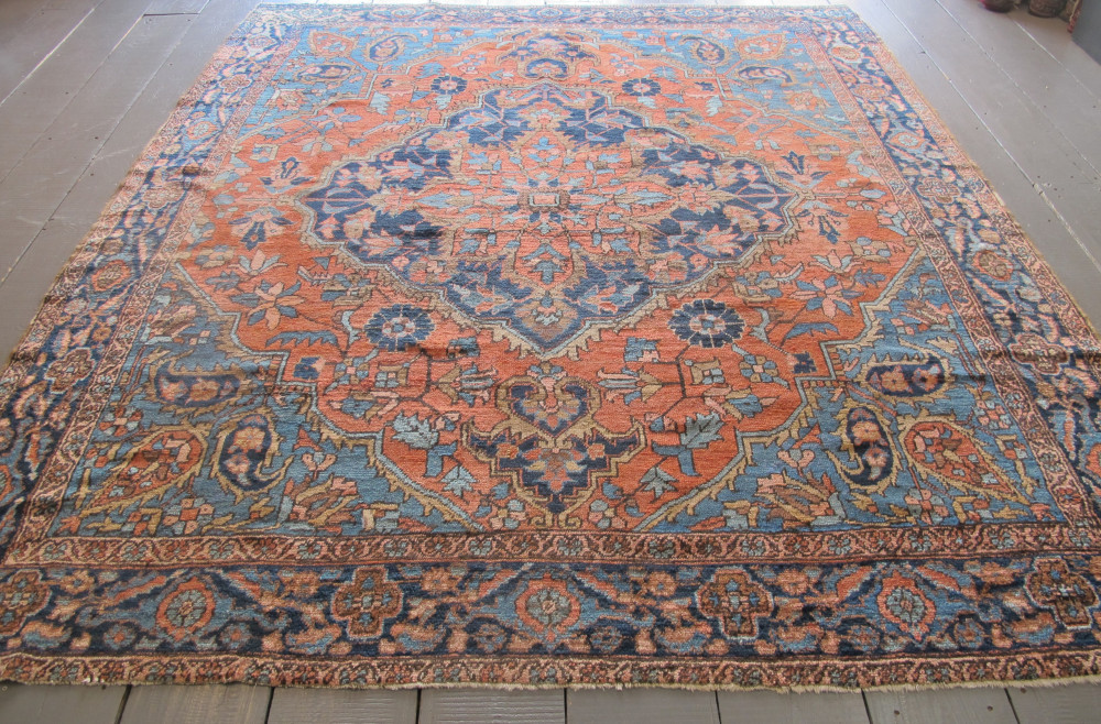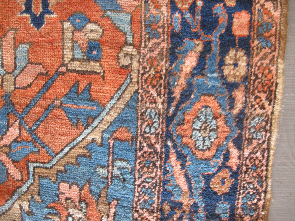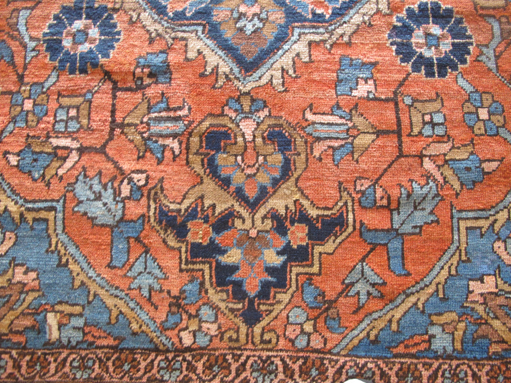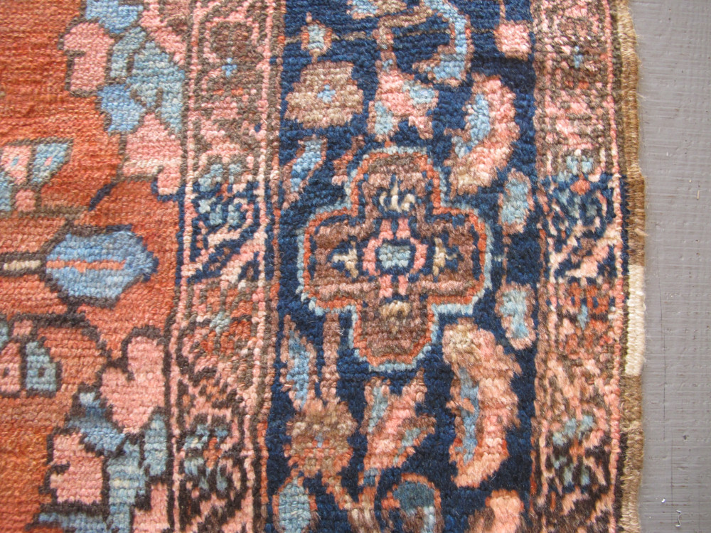 19th century Bakshaish carpets from North-West Persia are usually admired for their archaic drawing. However, this delightful small Bakshaish carpet is somewhat atypical. The large floral anchor medallion is drawn in a very naturalistic manner as are some of the other floral elements, including the botehs in the spandrels and blossoms in the field. Nevertheless, the structure of the weave, the soft wool quality and wonderful colours which includes a really subtle terracotta and two shades of pale blue are very much in the Bakshaish repertoire. It is a really decorative little carpet which coupled with the squarish format makes it a rare treasure.