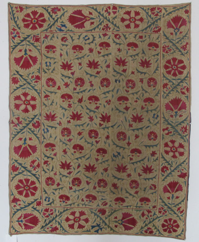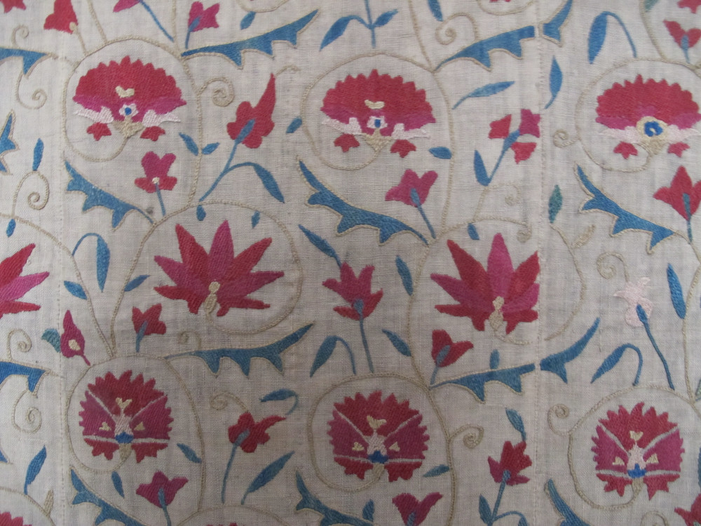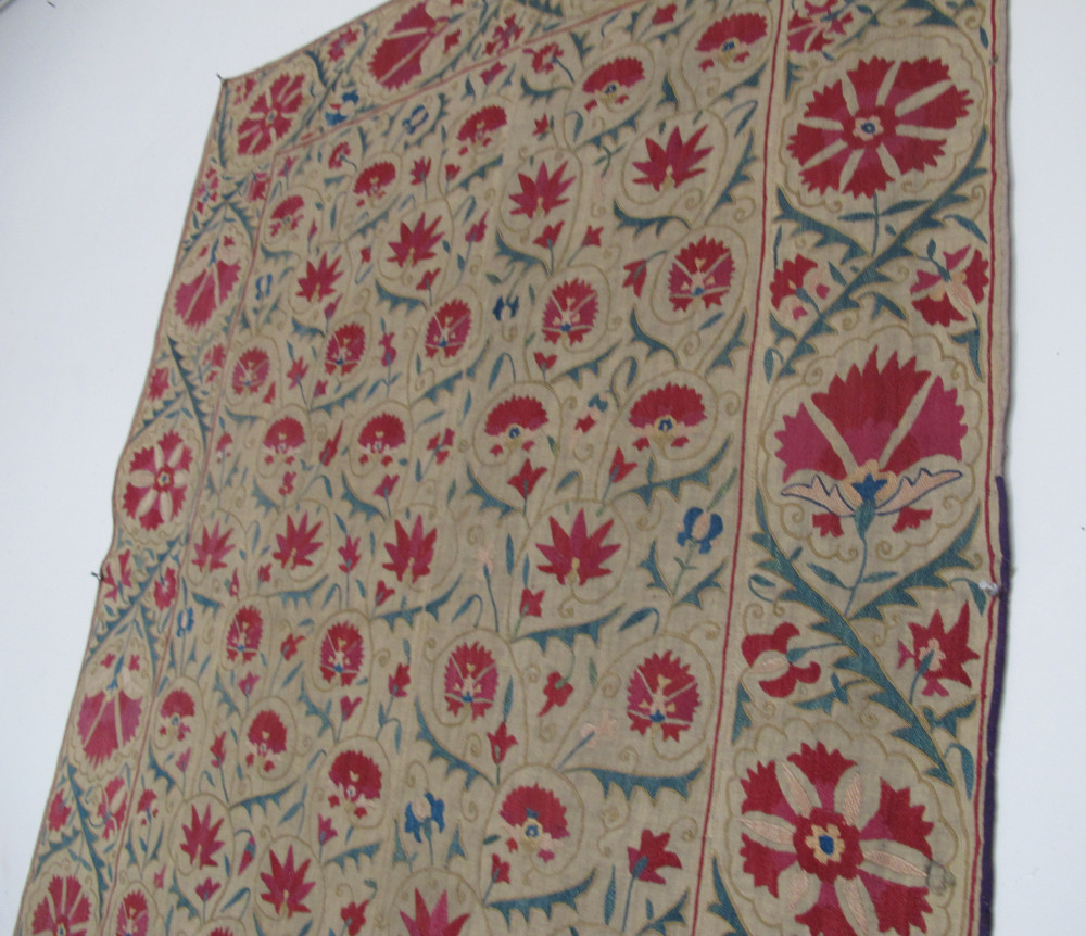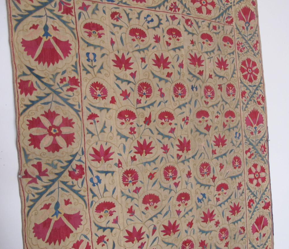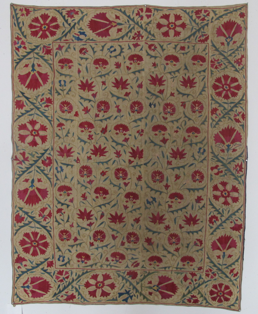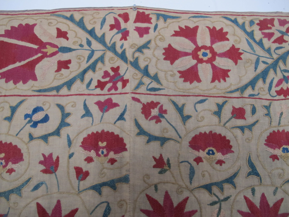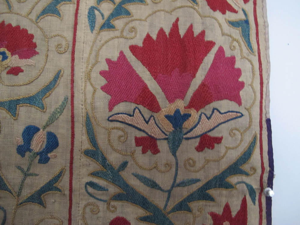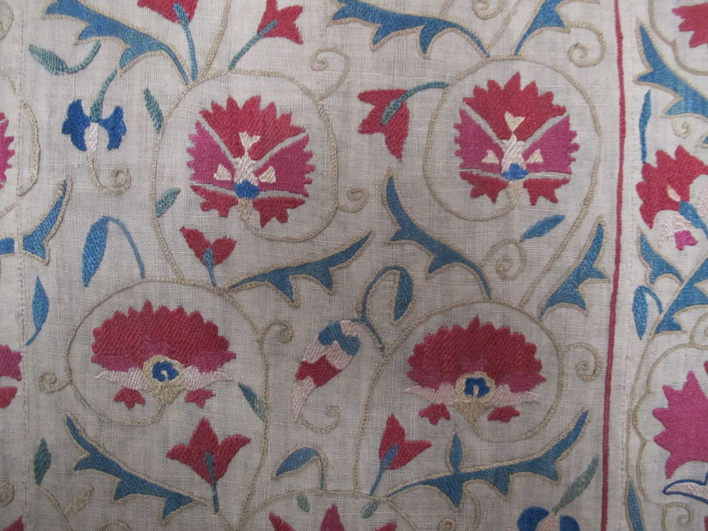 Occasionally, something special passes through my hands which reminds me how lovely the world of antiques and rugs is. This Bokhara Suzani hits the spot. Its a miniature size, smaller than a Nim-Suzani, and yet the balance and scale of the design is absolutely wonderful. There is a very subtle range of colours with a varied array of flowers, and the design flows elegantly through the field, linked by gold tendrils and leaves in shades of green and blue. The embroiderer even managed to include one or two little additional floral elements, if one looks carefully. The field composition is framed by an equally elegant border with larger scale floral ornaments and a wonderful flowing green leafy arabesque which runs around the entire composition. If there was ever a suzani that was made as a dowry piece this would surely be it. Cherished throughout the generations, it has survived in excellent condition and with no visible staining. As an added bonus, it has three different pieces of old chintz lining on the back. Totally charismatic, this suzani is both highly collectible and decorative.