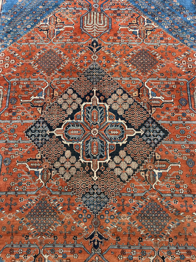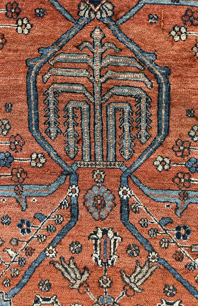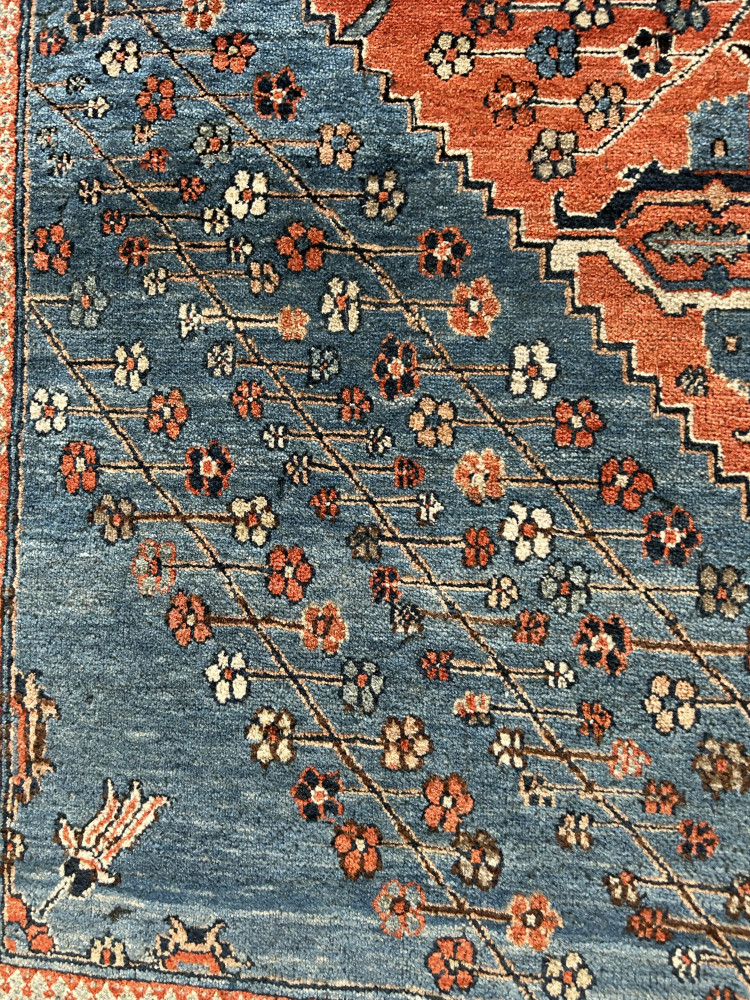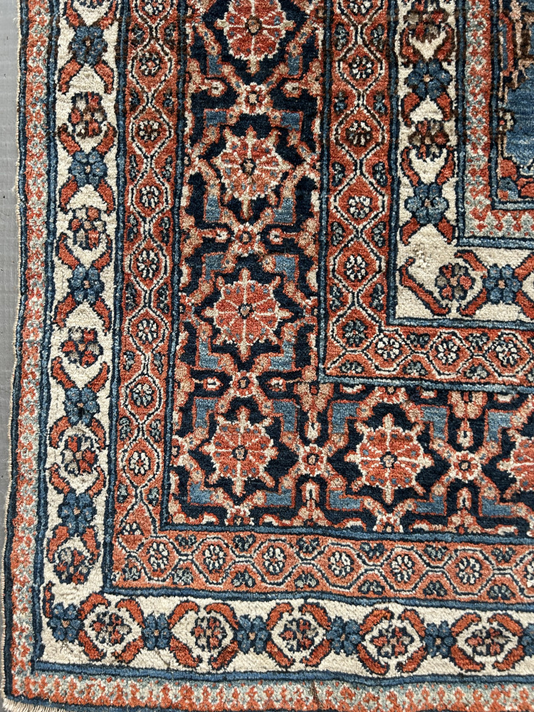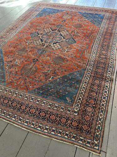 Mey-Meh is a town in Central Persia some 30 miles from Joshaghan where fine carpets with the well-known 'Shrub' design were made in the 19th century. This lovely carpet is a fine example. Interestingly, the ubiquitous shrubs appear in the central medallion while the rest of the field is decorated with stylised trees and geometric ornaments. Note the really charming light-blue spandrels filled with diagonal rows of tiny petals. The borders are equally distinctive. The main border of rows of stars is very beautiful and finely drawn, and is complemented by the ivory chain guard stripes. The entire composition is very elegant and extremely decorative. Please note also the excellent size which is rarely found in formal Persian carpets. Cherished over the generations, this piece has survived in excellent condition. Professionally cleaned,