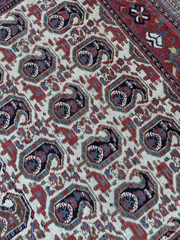 This is a delightful Afshar rug. Woven on a wool foundation, wool pile and excellent natural dyes, it has great tribal character. Rows of stylised botehs float above an ivory field with scattered secondary motifs, framed by a beautiful stylised floral border on an abrashed terracotta ground. Afshar weavers were influenced by the urban designs of the nearby Kirman workshops. This lovely tribal rug is a charming attempt to emulate the floral Kirman designs.