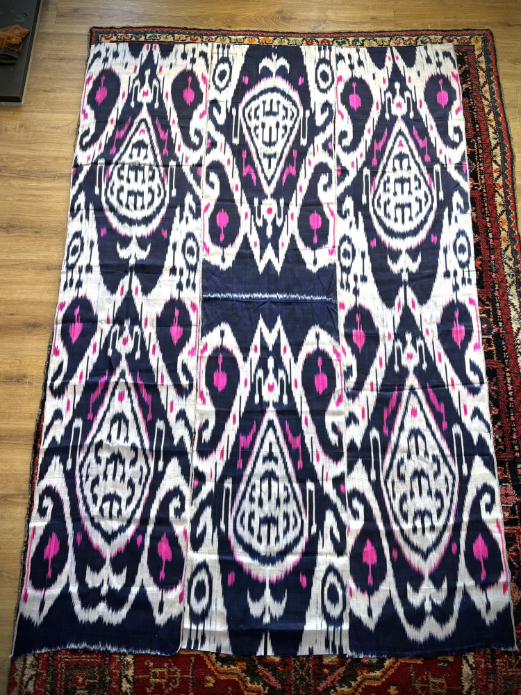 A charming bridal or dowry embroidery from Central Asia. Some condition issues due to wear and oxidation. Silk and wool embroidery on a cotton ground. The item has been washed and backed with an Uzbek Ikat. Third photo is of the back of the embroidery.