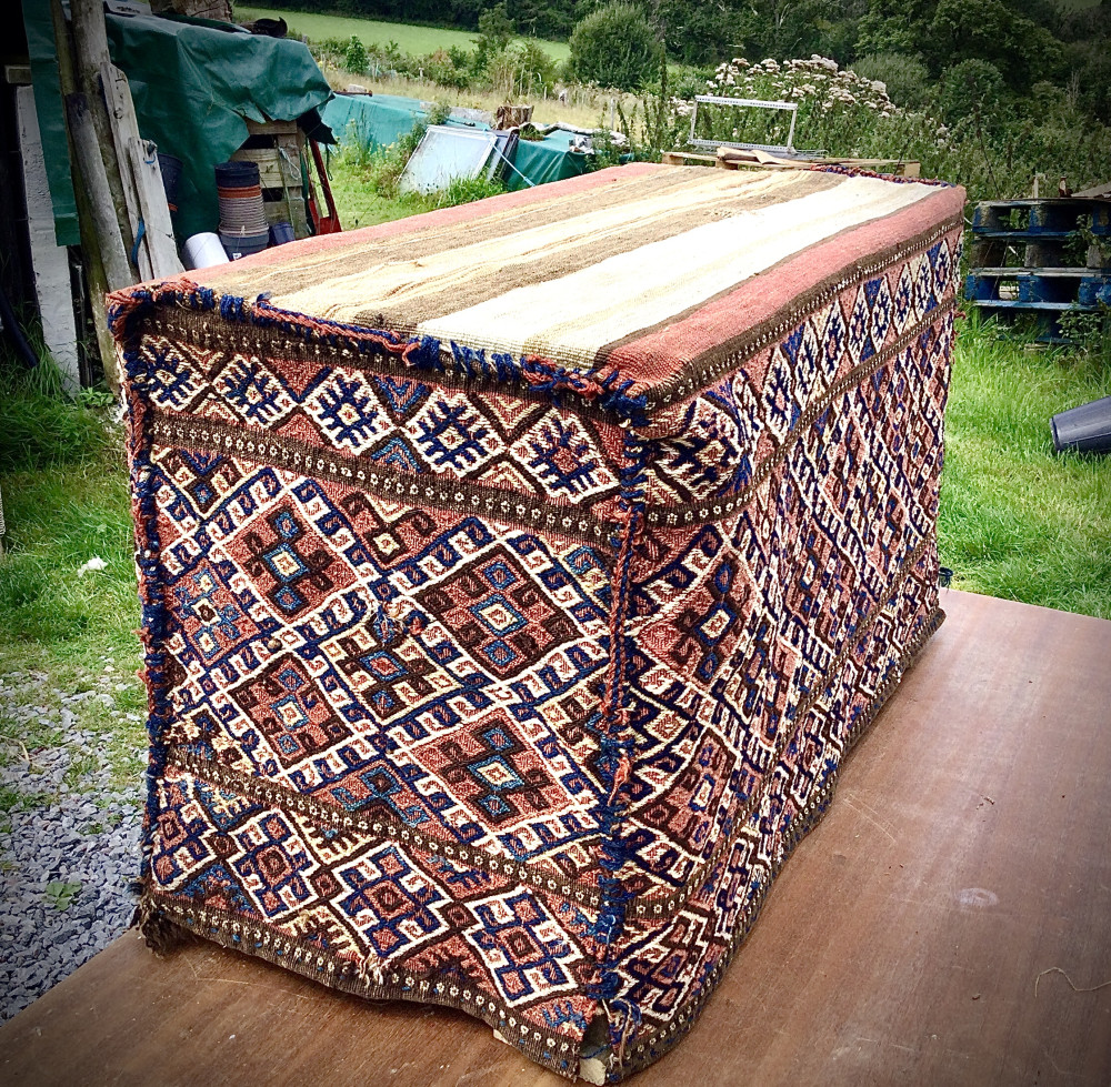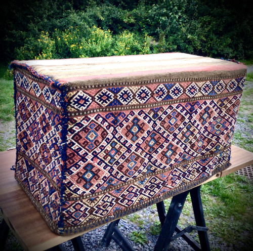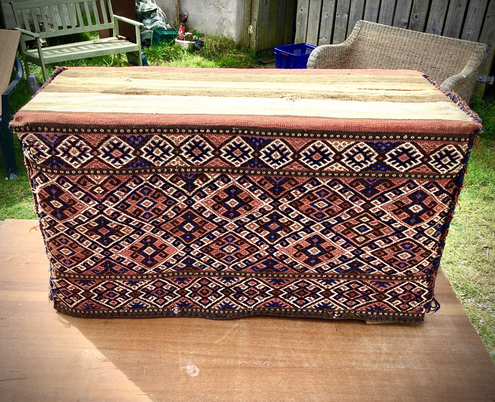 Lovely old Persian, flatweave, or ‘sumac’ weave, bedding bag or ‘mafrash’. Wear in one or two places, small repaired hole to bottom panel (which is the seat in the photos) Size: 100cm long x 40cm width x 55cm height