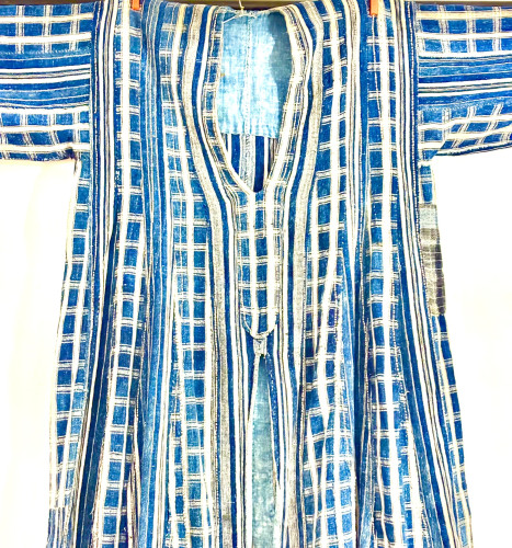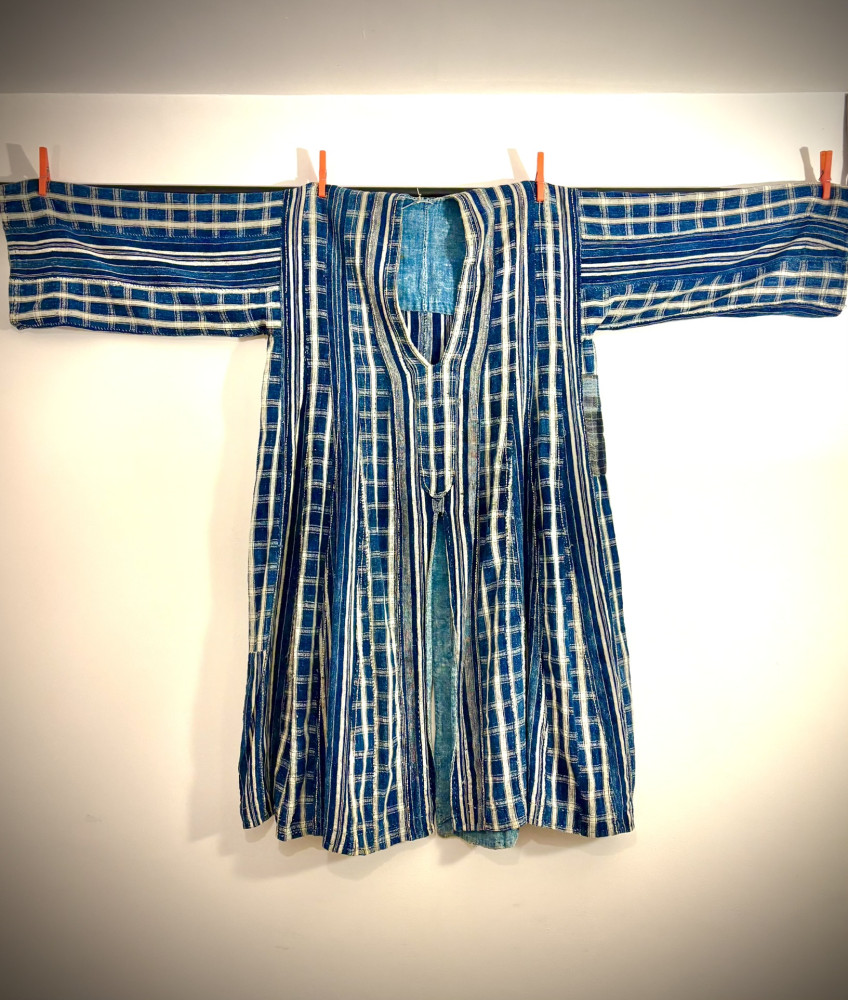 An attractive vintage indigo-dyed cotton West African men’s smock. Possibly from Benin or Togo, these were worn as a sign of authority, as they implied that the owner had a horse: therefore a ‘riding tunic’. Size: 140cm cuff to cuff / 100cm neck to hem.